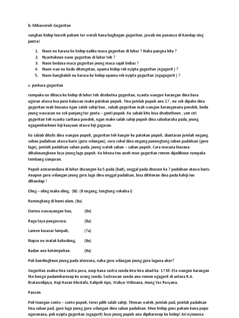 Guru Lagu Jeung Guru Wilangan Nyaeta Brainly Co Id from id-static.z-dn.net Soal bahasa indonesia kelas 7 semester genap kurikulum 2013 bagi bapak dan ibu guru smp tidak terasa, sebentar lagi akan memasuki ak. Guru wilangan dan guru lagu jurudemung adalah 8a, 8u, 6i, 8a, 8u. Puisi anu ditulisna bebas, teu kauger ku aturan guru lagu jeung guru wilangan kawas pupuh. Dalam pupuh, yang disebut juga dangding, suku kata atau engang disebut guru wilangan. Fadil sundanese 12 september 2015. Apan nu disebut moral téh nyaéta ahlak, ajaran laku lampah hade jeung goréng. Analisis guru lagu jeung guru wilangan? Lamun make pupuh, tangtu aya tambahanana, nyaeta guru laguna.