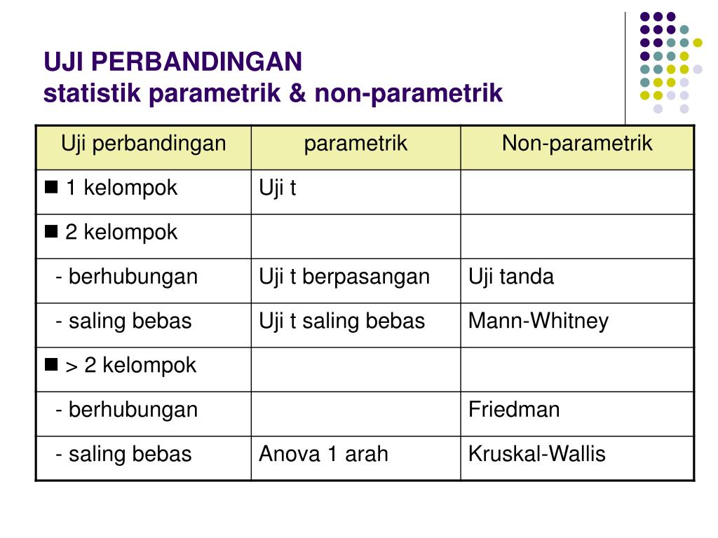 Kemudian, analisis ini digunakan ketika data . Statistik memiliki 2 tipe pengujian data, yaitu parametrik dan non. Analisis non parametrik digunakan ketika peneliti tidak tahu distribusi data yang diamati. Assalamualaikum wr wbberjumpa lagi bersama kami dalam bimbel (bimbing belajar) matematika dan statistika.kali ini kita akan membahas uji . Contoh penggunaan statistik parametrik seperti pada uji t dan f, yang aplikasinya banyak diterapkan semisal pada analisi regresi, path analisis, .