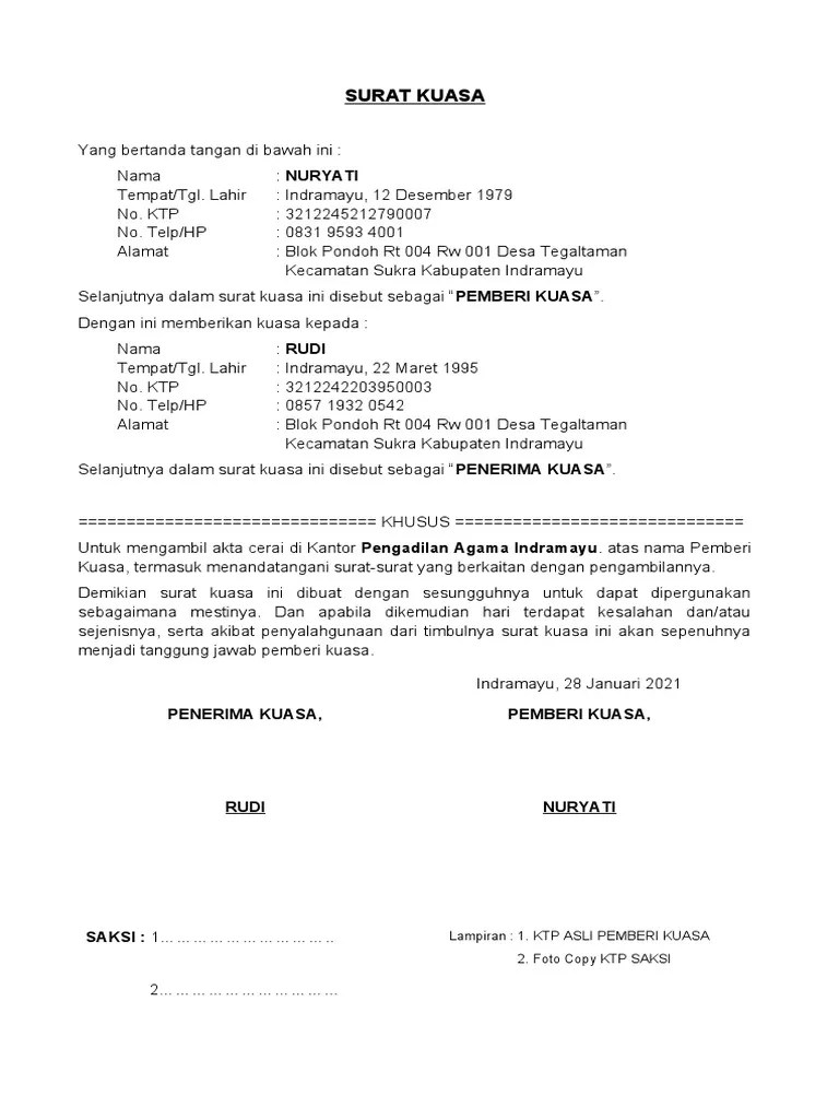Ini dia contoh surat kuasa khusus untuk pengambilan akta cerai di pengadilan agama oleh orang lain atau keluarga disertai link download dan .